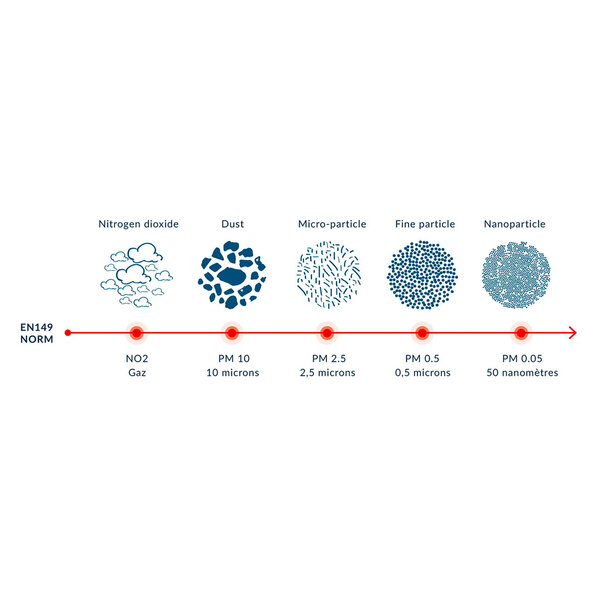 - filters nanoparticles from the air (up to a value of PM 0.05 = 50 x smaller than microparticles)